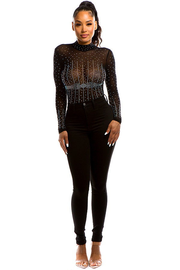 Black Multi Color Rhinestone Bodysuit